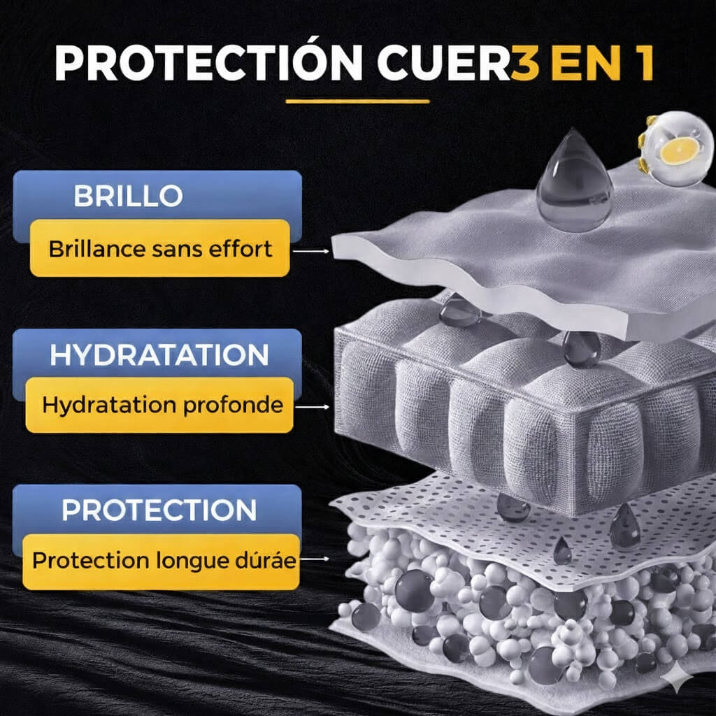 Nuestra fórmula ha sido desarrollada bajo estándares de alta calidad, combinando agentes hidratantes que respetan la integridad del material. Incluye una esponja aplicadora ergonómica diseñada para una distribución uniforme del producto sin rayar las superficies.